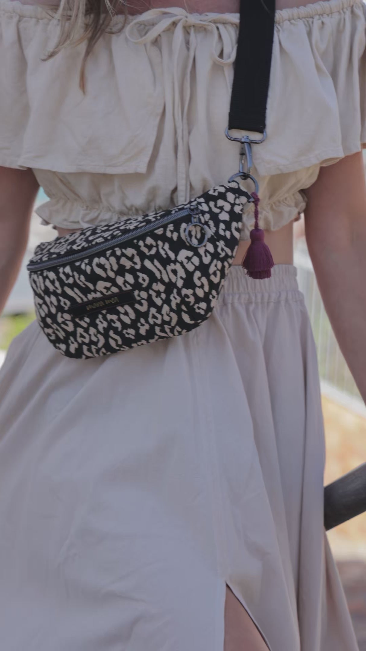 mara mea´s Mini Size Bauchtasche such a beauty im Schwarz/Creme Leo Style lässt den Animalprint auf feinste Weise in deinen Kleiderschrank hüpfen. Cremefarbenes Leopardenmuster auf Schwarzem Untergrund mit gleichfarbigem Tragegurt und seitlicher Tassel in Pflaume - was will man mehr? Die kompakte Variante der Bauchtasche lässt sich seitlich über die Schulter aber auch problemlos um die Taille tragen. Das nächste Festival steht vor der Tür? Hier ist der Begleiter für deine Essentials, die mara mea Mini Size Bauchtasche such a beauty im Leo Style in Schwarz/Creme.