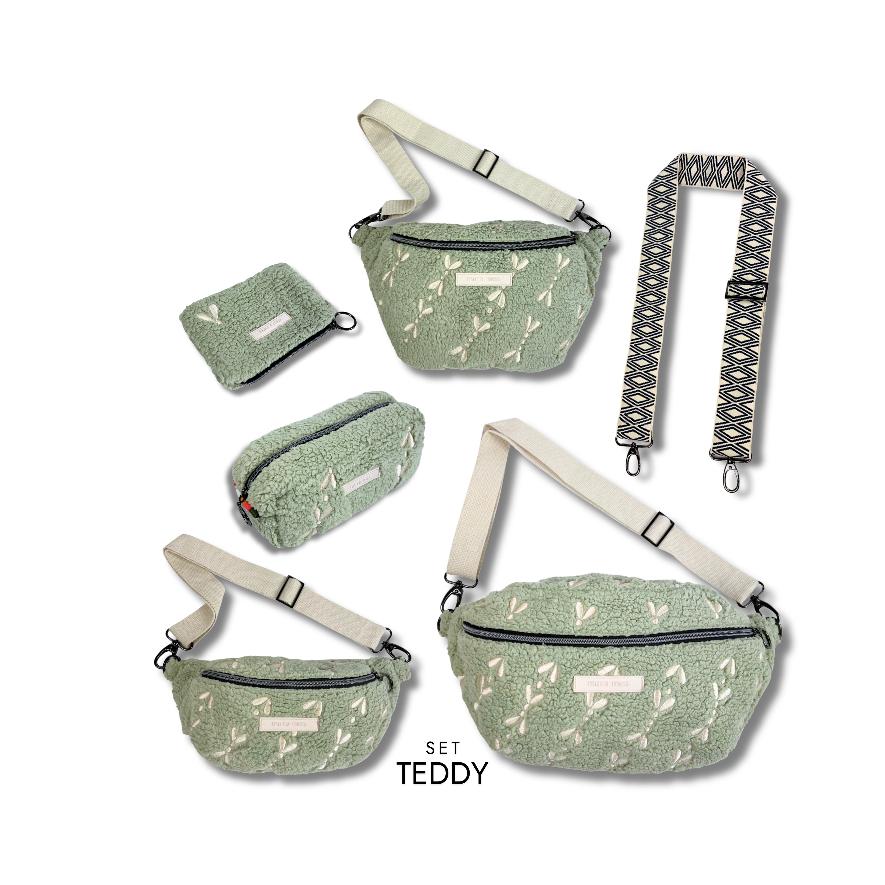 Ein Set wie eine Umarmung: salbeifarbener Teddystoff, zarte Stickereien, Leo-Futter und ein Hauch Rosa. Die Cozy Pieces verbinden Wärme, Leichtigkeit und Funktionalität – perfekt für entspannte Tage, Coffee-Dates und kleine Alltagsabenteuer.